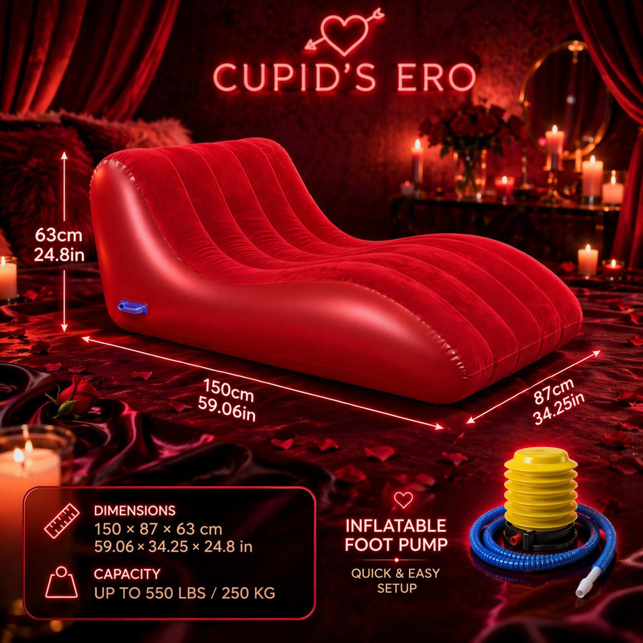 Experience divine relaxation with Ero’s Throne, the inflatable lounge designed exclusively by Cupid’s Ero for sensual living. Every curve supports your body in positions of ease and intimacy perfect for massage, relaxation, or shared touch rituals.